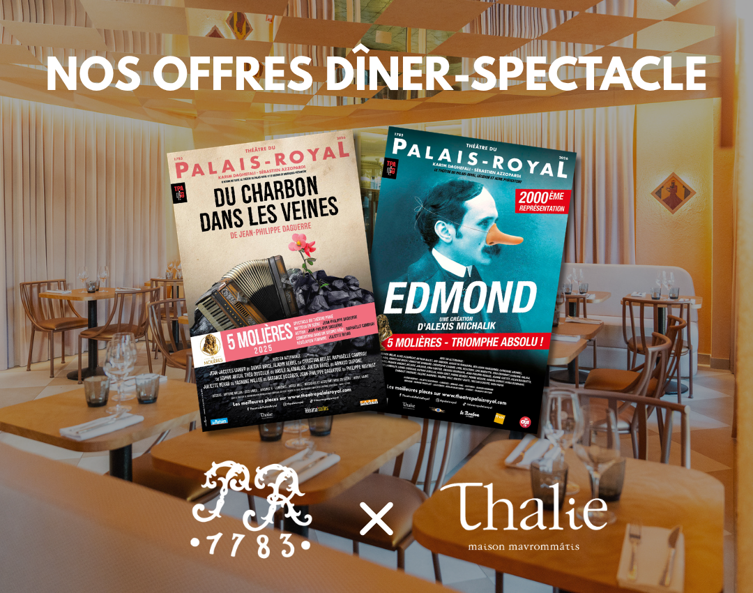 Le Théâtre du Palais-Royal et le restaurant Thalie-Mavrommatis s’associent pour vous proposer une formule prestige « dîner-spectacle » alliant plaisir des sens et divertissement.