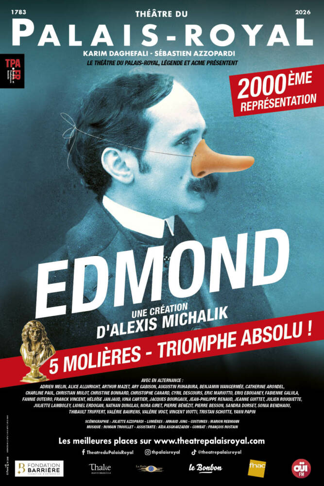 Depuis 2016, Edmond brille au Théâtre du Palais-Royal et s’approche de sa 2000ème représentation. Cette pièce d’Alexis Michalik, couronnée de cinq Molières, plonge le public dans la création du célèbre « Cyrano de Bergerac ». Avec une mise en scène ingénieuse et des performances remarquables, Edmond est devenu l’un des plus grands succès de notre époque.